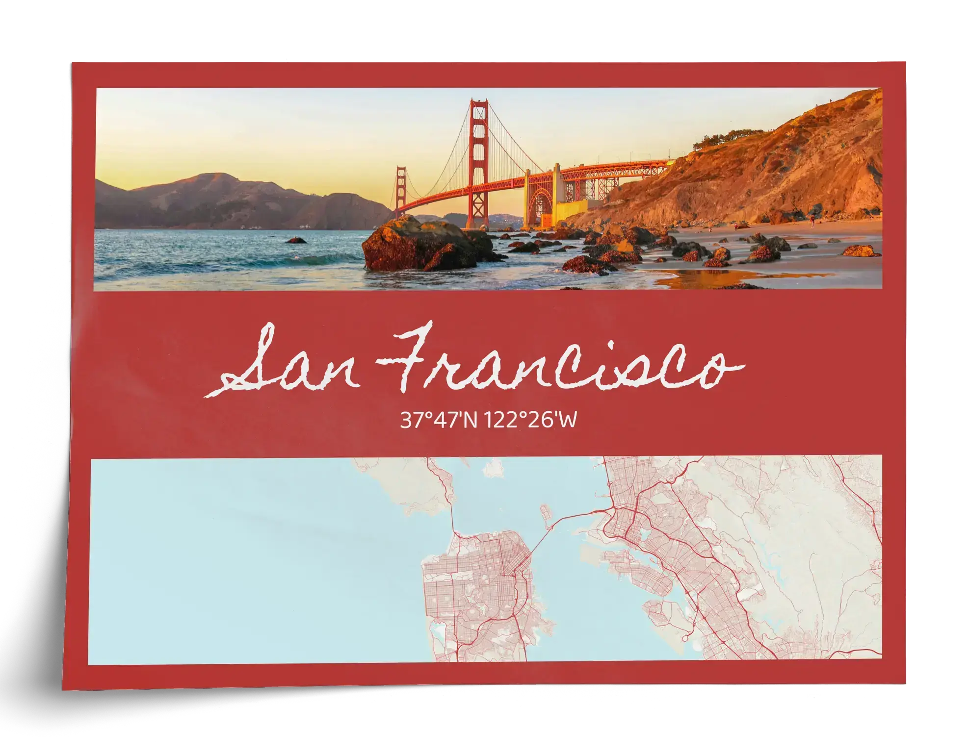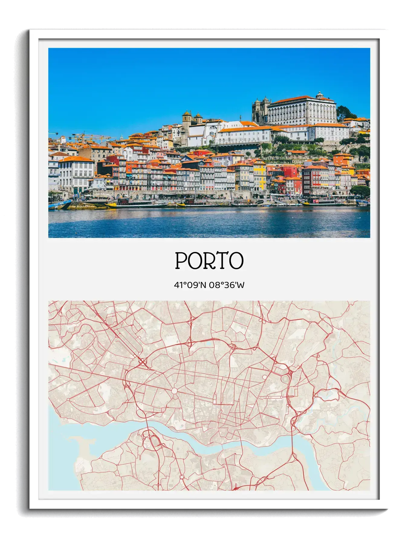 Create your own city story now and order it in just a few clicks. This Photocard-style print combines a city photo at the top with the city name and coordinates beneath it, paired with a clean, stylized map view of the same place. Change the city, swap the photo, edit the text, and fine-tune colors and the map area until it feels exactly right.